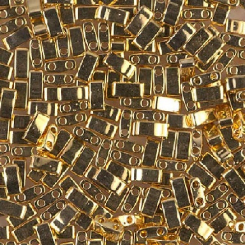 A 2.5 gram pack of Miyuki 2 hole 2.5 mm x 5mm x 1.9 mm Half Tila glass beads with 2 parallel 0.8 mm holes. Each tube contains around 60 beads