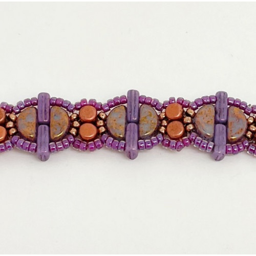 This kit contains sufficient Kos, Minos and Piros par Puca, together with seed beads in sizes 8 and 15, and all the findings needed to create up to a 20cm or 8 inch version of bracelet in the image. The only thing you will need to provide is a needle and your choice of thread, although you are, of course, welcome to personalise your bracelet by changing the colours of the seed beads