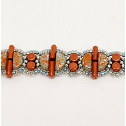 This kit contains sufficient Kos, Minos and Piros par Puca, together with seed beads in sizes 8 and 15, and all the findings needed to create up to a 20cm or 8 inch version of bracelet in the image. The only thing you will need to provide is a needle and your choice of thread, although you are, of course, welcome to personalise your bracelet by changing the colours of the seed beads