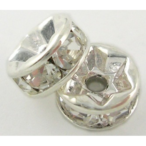 Silver colour brass and clear rhinestone spacers. 6mm across, 3mm deep with a 1mm hole 25 in pack